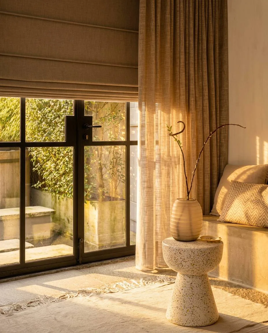 Inbetween gordijnen zijn semi-transparante gordijnen die tussen vitrage en traditionele gordijnen in zitten. Ze laten daglicht binnen, maar voorkomen dat mensen van buiten naar binnen kijken. Daardoor zijn ze ideaal voor bijvoorbeeld de woonkamer waar je privacy wilt zonder het uitzicht te verliezen.